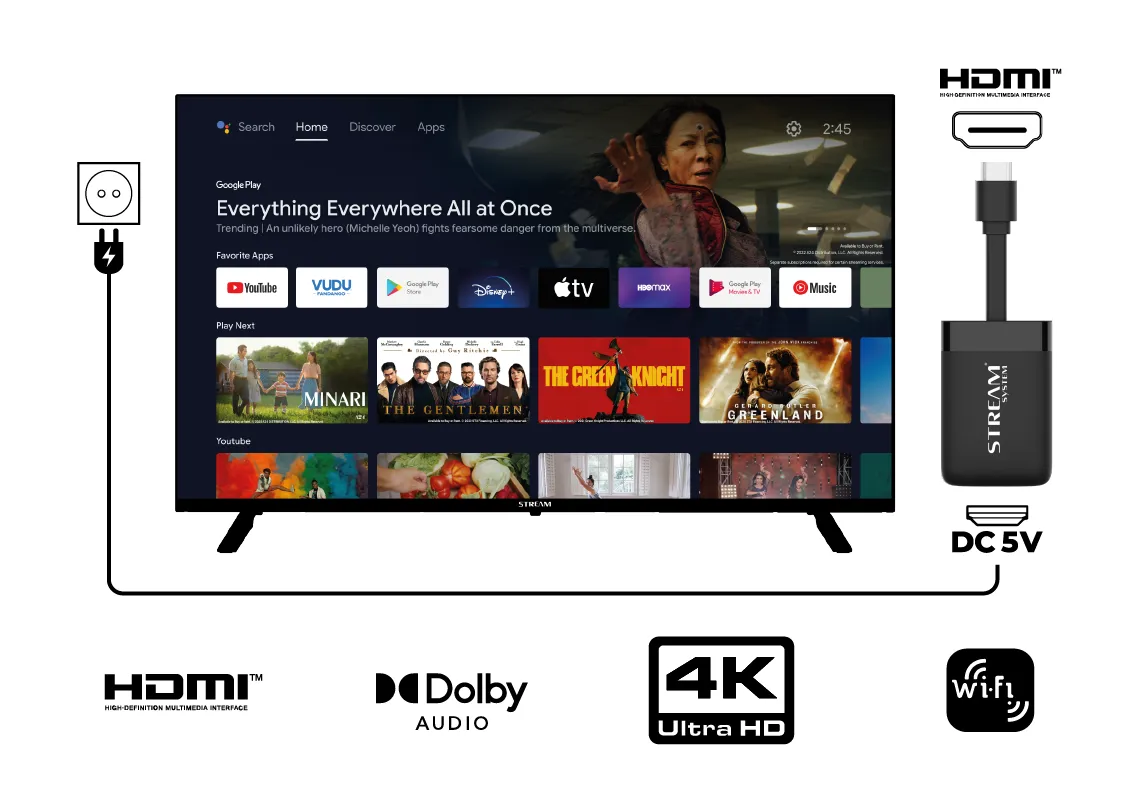 The STREAM dongle is accompanied by an Android TV remote control which allows you to use your LED television as a Smart TV!